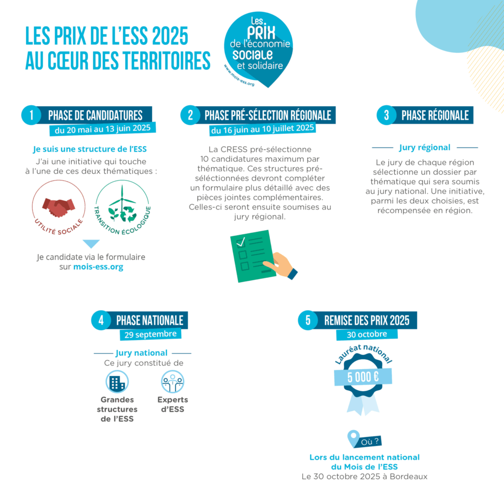 Les prix de l’ESS sont animés dans chaque région par les Chambres Régionales de l’Economie Sociale et Solidaire (CRESS) et coordonné au niveau national par la Chambre Française de l’ESS, ESS France.