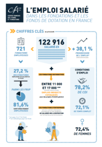 Cette étude montre ainsi que l’emploi dans les fondations et les fonds de dotation, représente 123 000 salariés (dont 72.4% d’emplois féminins), en progression de +38,1%en 10 ans !