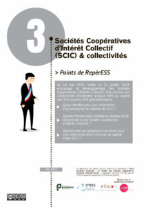 La loi sur l’ESS, votée le 31 juillet 2014, encourage le développement des Sociétés Coopératives d’Intérêt Collectif. Elle permet aux collectivités d’intervenir jusqu’à 50% au capital des SCIC (contre 20% précédemment).